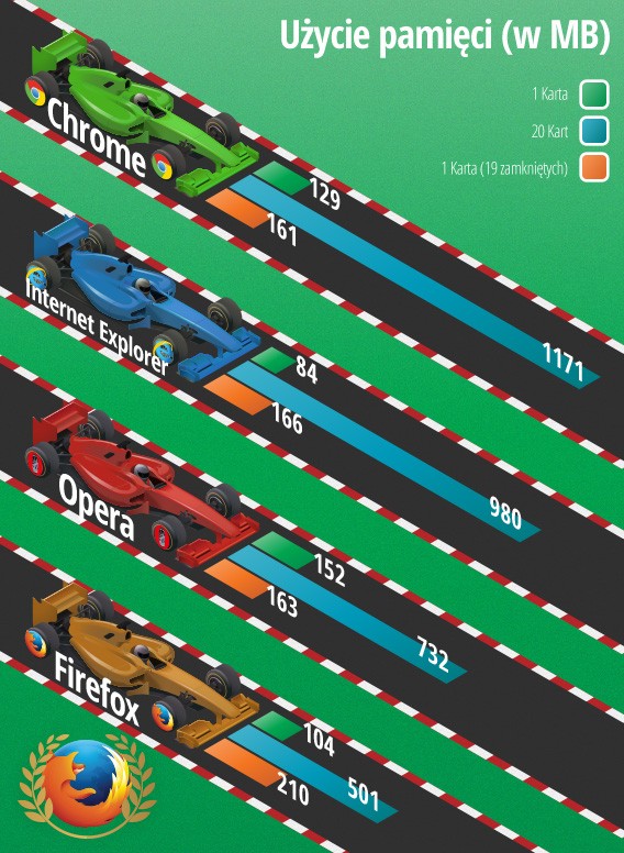 Opera pod względem zużycia pamięci radzi sobie dużo lepiej niż Chrome; jedynie Firefox jest w tym zestawieniu lepszy